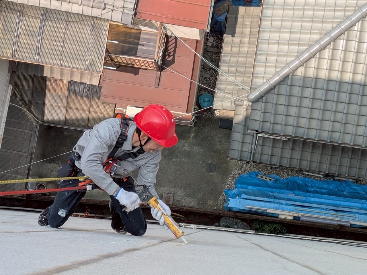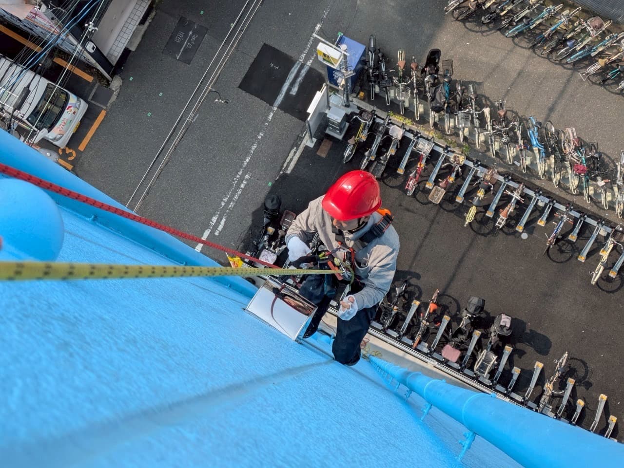 ロープ作業とは、仮設足場を設けずに、建物の外壁にロープを使って直接アクセスする高所作業技術です。高層階の外壁補修や雨漏り対応に適しており、仮設費用を抑えたいオーナー様にとって有力な手段となります。